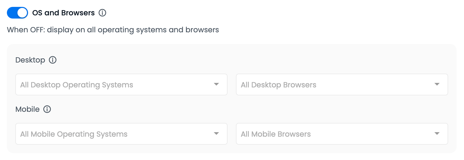 Pomocí této funkce můžete přizpůsobit svůj widget tak, aby se zobrazoval 👔 návštěvníkům procházejícím váš web z konkrétního OS (nebo více OS) nebo prohlížeče (prohlížečů). Můžete se například rozhodnout, že se váš slevový kód zobrazí pouze návštěvníkům, kteří procházejí z mobilního zařízení iPhone nebo z prohlížeče Google Chrome na počítači.