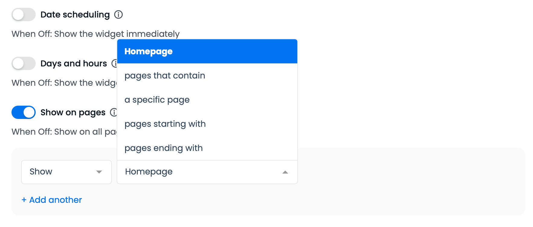 Nyní se můžete rozhodnout, zda chcete widget zobrazit na konkrétních stránkách. Můžete použít pravidla jako „domovská stránka“, „obsahuje“, „přesná shoda“, „začíná na“ a „končí na“.