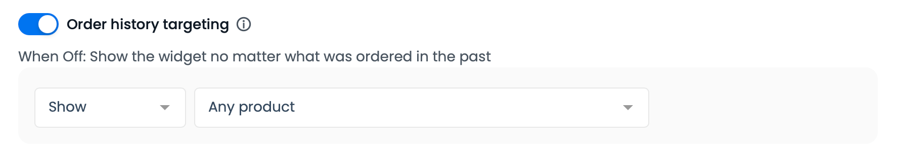 Přejděte na stránce dolů a v části Cílení vyhledejte možnost „Cílení na historii objednávek“. Upozorňujeme, že je k dispozici pouze pro profesionální uživatele. Přepnutím nastavení jej aktivujete. Pokud je widget vypnutý, zobrazí se bez ohledu na to, co bylo objednáno v minulosti.