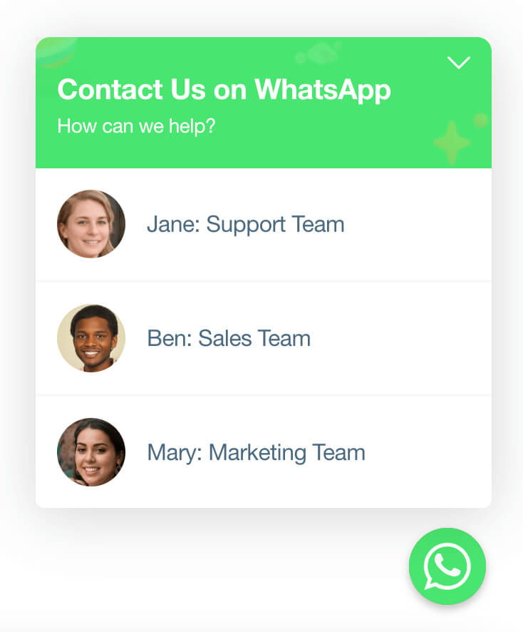 WhatsApp, Facebook Messenger, SMS, Instagram, Telegram, Line, WeChat, Twitter, Google Maps, Slack, Phone (click to call), e-mail, Skype, Snapchat, LinkedIn, Viber, VKontakte, Waze, Poptin pop-ups and three custom channels of your choice, e.g. a link to an external channel or contact page
