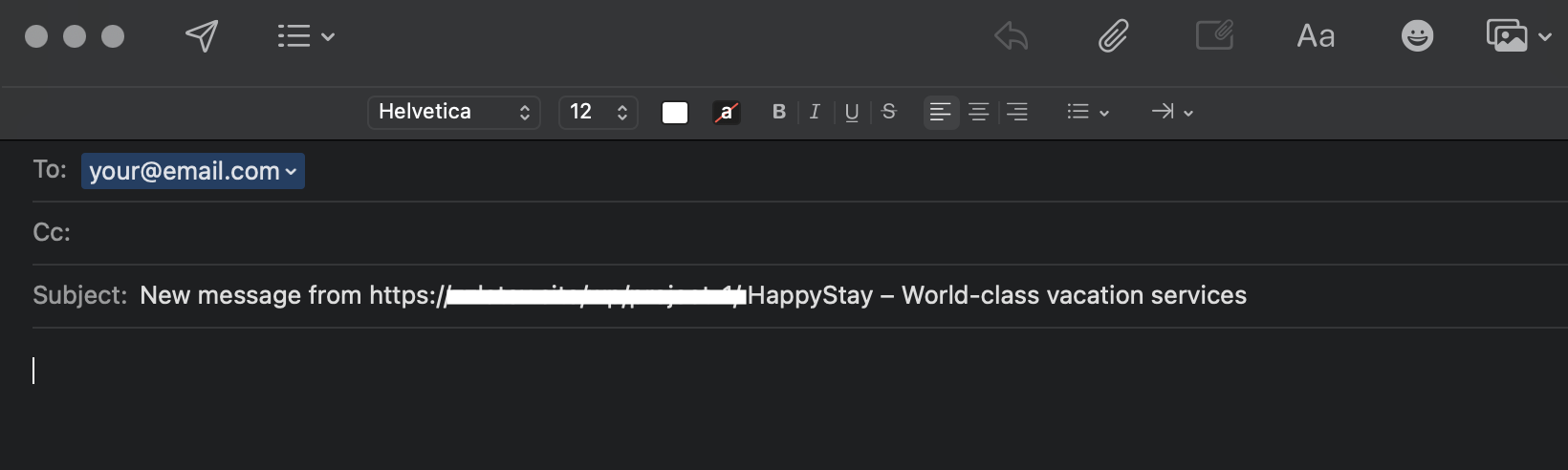 As mentioned, you can also add a title and URL tags to your pre-set message subject. The {title} tag grabs the name of the page the mail was submitted through and the {URL} tag grabs the page URL. So for example if your pre-set message subject is ”New message from!” and you add both title and URL tags, this is how it will look like if your website visitors send an email from your website homepage: