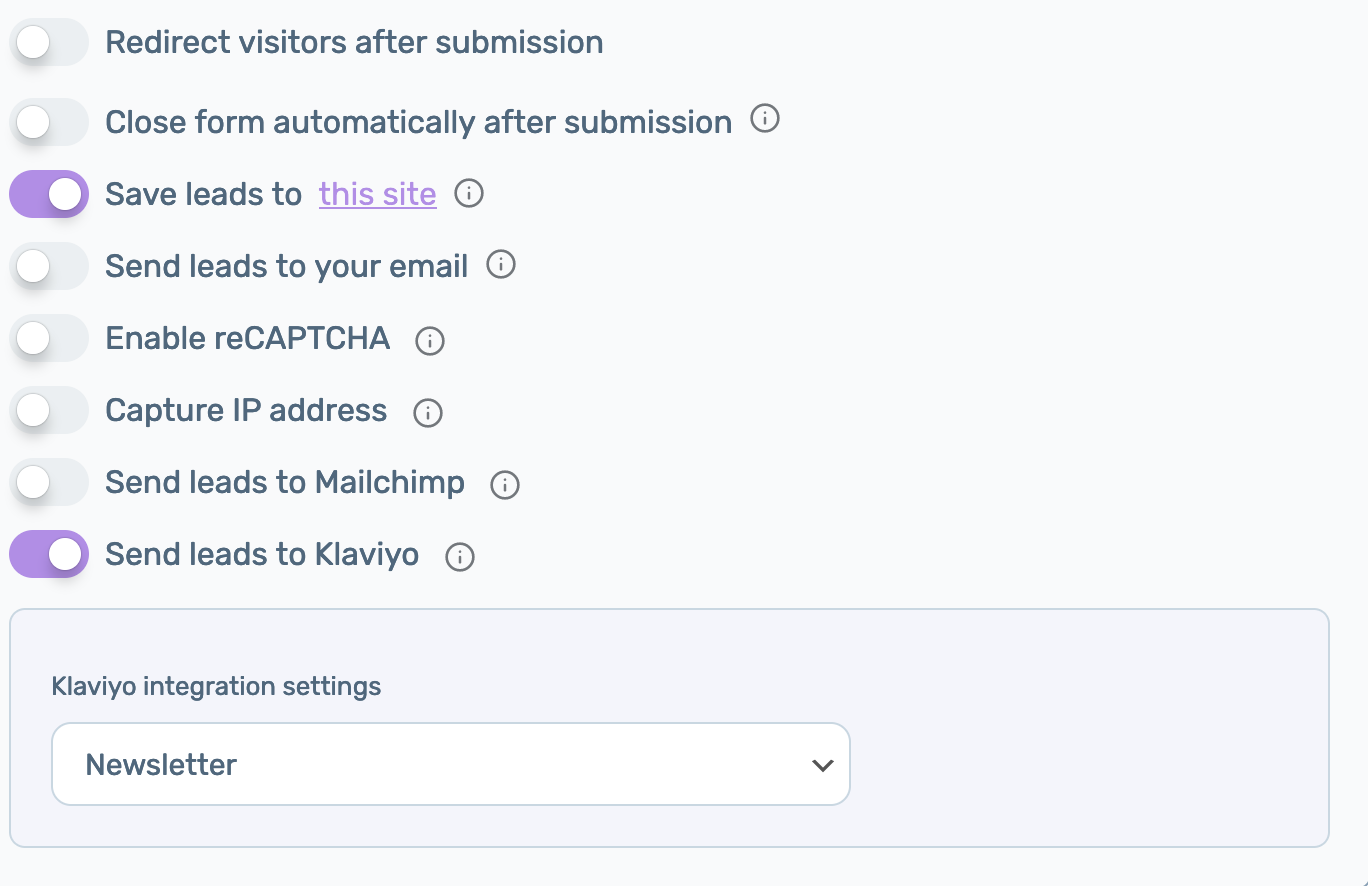 Step 4: Finally, open your Chaty plug-in dashboard and in the “Contact Form” channel settings, scroll down and check the ”Send leads to Klaviyo” box. From the Klaviyo integration settings you can select a Klaviyo list to send your leads to if you have any preferences.