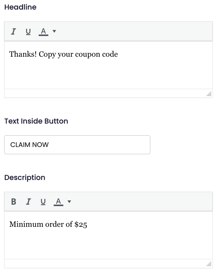 Finally, proceed with filling in the headline (the text above the “Apply” button), button text and description (the text below the button) and choose the desired colours for each of the settings.