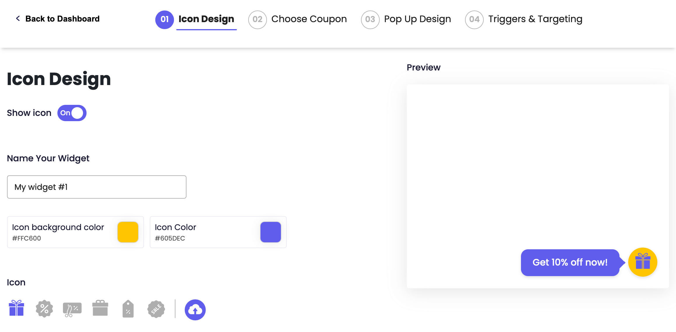 In this guide we’ll show you how to hide your Coupon X icon so that you only show the pop up based on your triggers, without a widget at the bottom of the page.