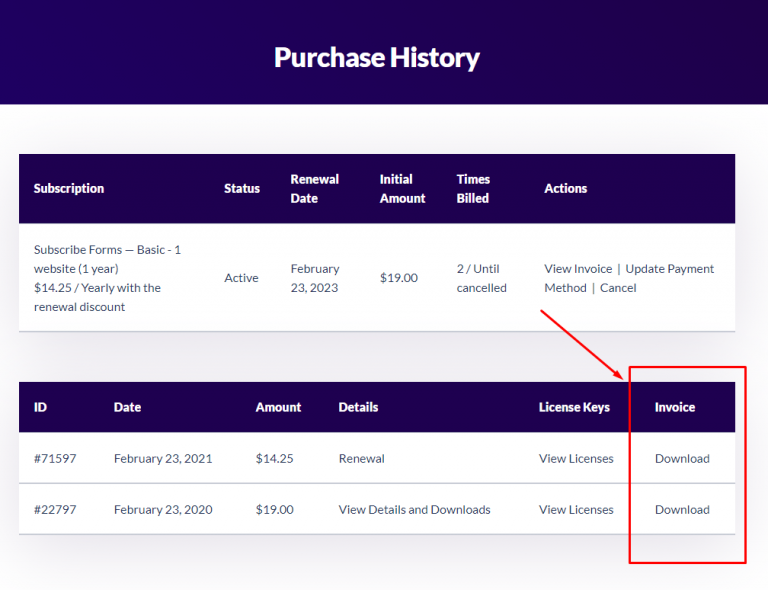 You can also download your invoice (and renewal invoice, where applicable) by clicking on ”Purchase history” within your Premio account, like so: