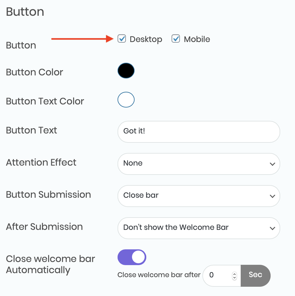 You can also choose whether you want the URL to open in a new tab or not, as well as whether you want your welcome bar to appear on desktop or mobile, or both. Moving on to the next step. By default you will have a button on your welcome bar – you can see it in the Preview window to the right of your screen. If you don’t want to have a button in your welcome bar, make sure you uncheck both desktop and mobile from the Button menu. If you want to keep the button, head over to the next steps to customize it to your preferences.